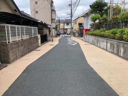 道路がゆるくジグザグに塗装されており、少しでもスピードを落としてもらう工夫がしてあります。