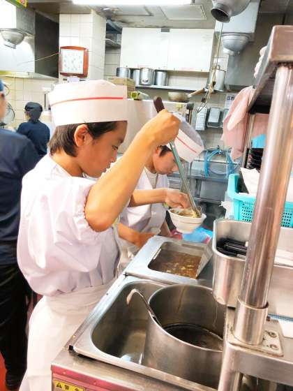スープを注いだり、ご飯を盛りつけたりと、仕事に励んでいました。