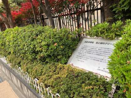 学校掲示板は生徒通用門と正門の間にあります。また、学校の東側は植物を植えたグリーンベルトと称されています。