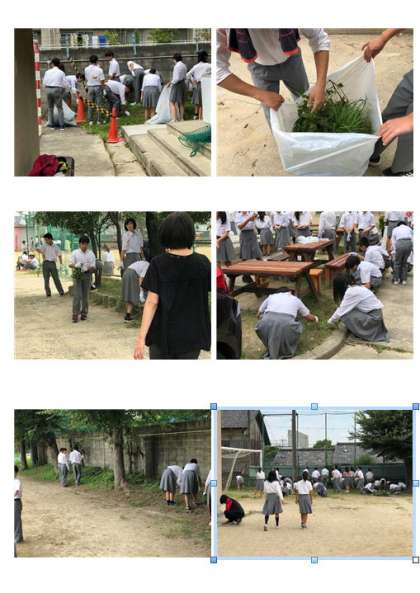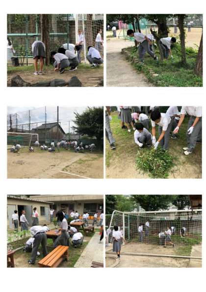 体育大会の3色に分かれての草抜き大会に多くの生徒が参加しました。