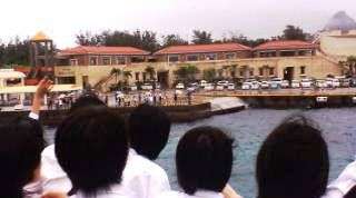 フェリーが伊江島を出発しました。みんな名残惜しそうです。わずか2日間でしたが,それ以上の大きな思い出をいただきました。島の方々も,必死で手を振ってくださっています。修学旅行もラスト1日,「心のお土産」という素晴らしいものをしっかりと持って帰ります。