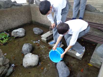 理科部が管理するビオトープに本日、メダカが放流されました。