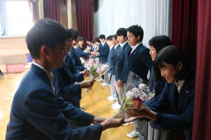 新生都会本部役員から旧本部役員にこれまでのがんばりに感謝を込めて花束が手渡されました。旧本部役員の皆さん、ご苦労様でした。