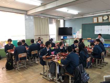 中学校全員給食第1弾として、3年生が全員学校給食をいただきました。カレー味の唐揚げが特に好評でした。