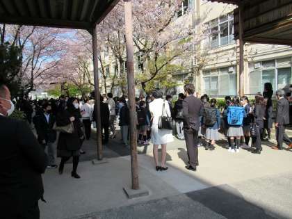 桜に囲まれてクラスの発表。新しい出会いの瞬間です。たくさんの人とのつながりを作り、人間的に成長できる中学校生活を、この仲間たちとともに送っていきましょう。