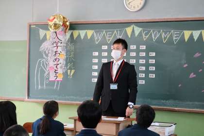 例年なら、入学式後の学活の様子を見に教室に上がっていただいたのですが、今年度は密集を避けるために上がっていただけませんでした。せめて教室の様子だけでもご覧ください。新しいクラスメートとともに、担任の先生との出会いを楽しんでくれました。