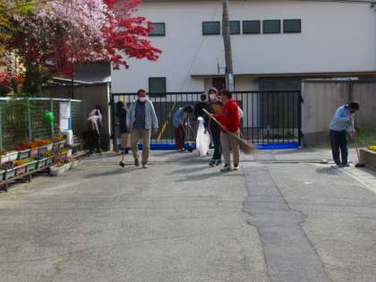 美しい桜が散った後は、一人の力で片付けられないのがつらいところです。本当に見事な桜のトンネルですが、散っていくと、校内はもちろん地域にも花びらが広がり、近隣の方々には迷惑をおかけしています。毎朝、早朝から管理用務員さんが校門前の桜の花びらを掃除して、その後教員も合流して校内外の掃き掃除をしています。ありがたいことに、生徒登校がある日はボランティアの生徒たちもたくさん来てくれています。何事もそうですが、作り上げることだけでなく、その後を片付けるところまでやり抜くことが大切です。美しい桜のトンネルになることを願ってこの桜の木々を植えてくださった方々の想いを大切にできる太秦中学校でありたいと思います。