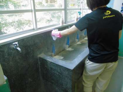 ドアや手すり,水道の蛇口,トイレなど,皆の手が触れそうな場所を,次亜塩素酸ナトリウムを希釈した消毒液を雑巾に浸して拭いていきました。