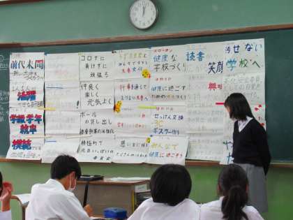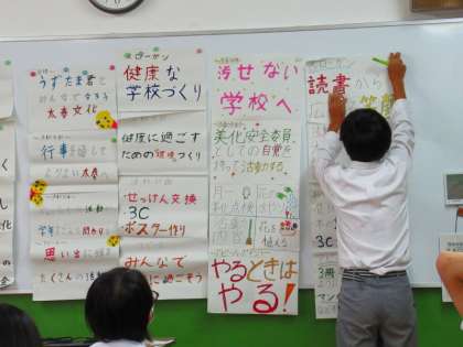 各クラスの委員の人は、ちょっぴり緊張しながら、クラスのみんなの前に立ちます。委員会で作ったポスターを黒板に貼ってから話し始めます。