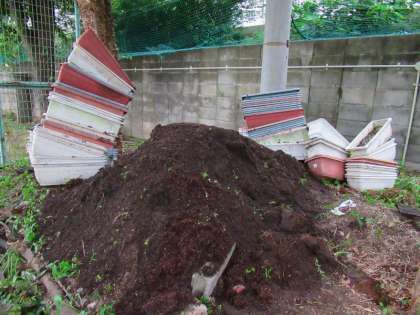 汗を流しながら、一生懸命作業してくれているのは、美化安全委員会の面々!正門と東門の中のプランターが、春の花が咲き終わり土だけになっていました。その膨大な量のプランターを、部活倉庫の北側に運んで、整備してくれました。
