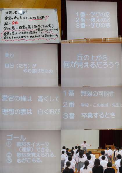 歌には、作った人の想いが込められています。その想いに心を寄せ、そして自分の想いを乗せて校歌を歌う、そんなかっこいい君たちの姿を楽しみにしています。