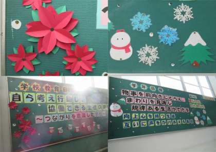 南校舎東階段の掲示板が、12月バージョンにリニューアルされているのをご存じですか?秋から冬に季節が移っていく12月らしい。様々なデコレーションが施されています、。紅葉、そして雪、雪だるま・・・、秋から冬への移り変わりがモチーフになった作品が並んでいます。