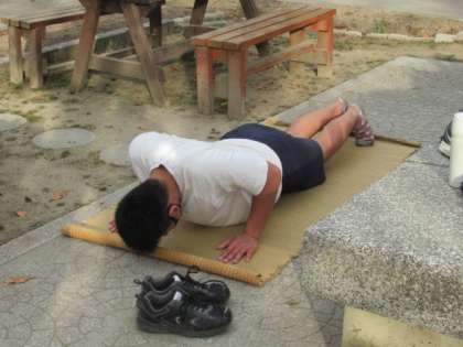 鉄球を持ってのスクワット、体を地面すれすれまで落とす腕立て。