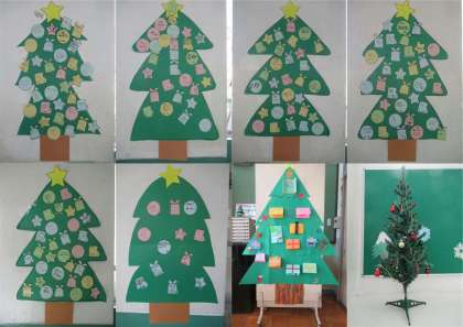 去年の12月に文化委員が型取りしてツリーを作成し、そこに各クラスで一人ずつ来年の目標を書いたものを掲示してくれました。(写真の最後のツリーは2年5組で作って、階段の踊り場に設置してくれたものです。)