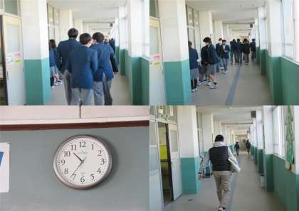廊下では、友達となごやかに過ごす太中生の姿がありました。ところが、チャイムも鳴らず、誰からも声が掛かっていないのに、少しずつ教室に入ってきます。