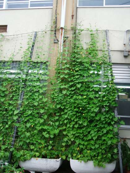 立派なゴーヤの実がなっています。つるもグングン伸びて,網を越えてしまいました。二階の窓のあたりまで伸びています。
