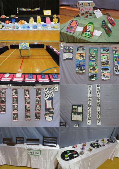 さて、昨日と今日の2日間、南太秦小学校作品展が行われています。太中からも、国語(書き初め)、美術(京菓子・毬・ゴム印)、技術(木材加工)の作品を出品しました。南太秦小学校体育館に入ると、小学生の作品と一緒に、中学校の作品も展示していただいていました。