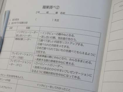 というテーマで、先生へのインタビューや職業調べ、発表準備、そして発表という流れで取り組んでいます。