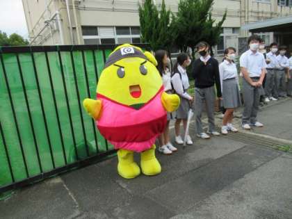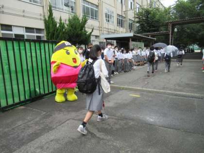 太中の妖精「うずたまくん」も飛び入り参加のあいさつ運動でした。
