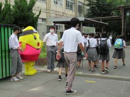 さて、今日のあいさつ運動は黄団です。うずたまくんと一緒にあいさつ運動に取り組みました。久しぶりに、雲の間から青空が見えました。