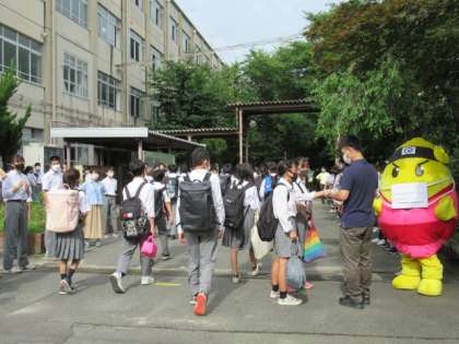 今日のあいさつ運動には、うずたまくんも感染対策のマスクを着用して参加してくれました。