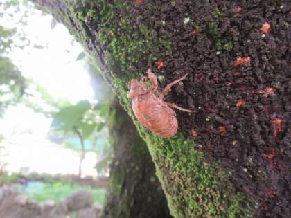 と思っていましたが、今日、いこいの広場で聞こえたセミの声で誘われて、木をじっくり観察すると、見つけました!セミの抜け殻!やっぱり間違いでなかったのです。