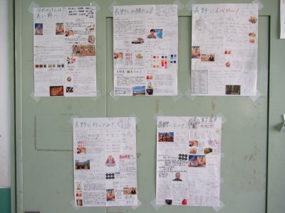 3年生は、来週の火曜日から待ちに待った修学旅行です。3年生のフロアには、去年長野について調べ学習をして作成した長野の紹介新聞が掲示してあります。2年のクラスの班でそれぞれ作って、クラスでベスト1を選んだ、とっておきの5枚です。どの班の作品も大作揃いで、1つに選ぶのは大変だったとか。あのときも頑張りましたね〜。