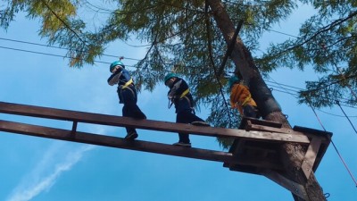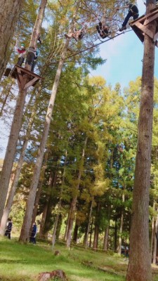 すごい高さです。丸太を渡ったり、ネットに捕まったり、ときにはインストラクターさんに助けてもらいながら、アスレチックを進みます。