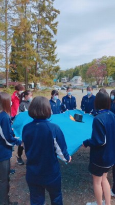 終わったチームは地上でゲーム中。皆で協力してブルーシートを揺らし、バケツの中に人形を入れられるかな!?