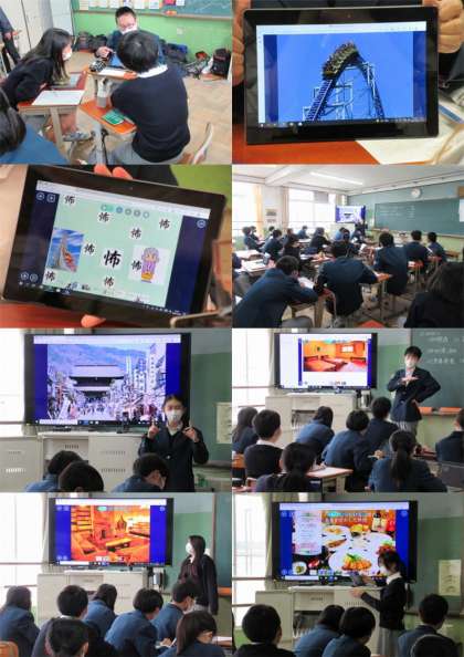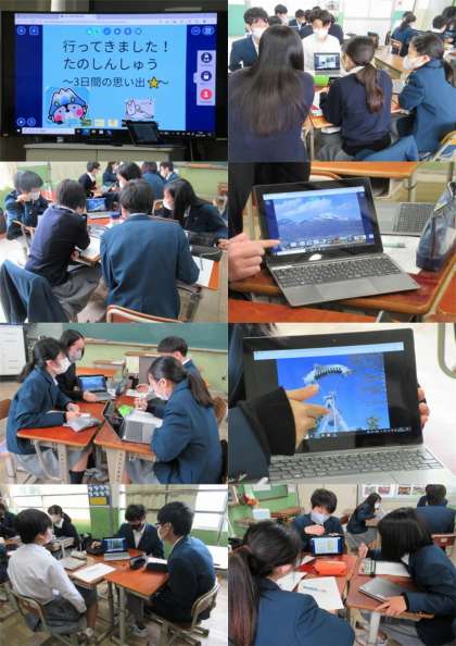今日の3年生は、修学旅行事後学習の発表会を、ロイロノートを活用して行いました。まず各自発表練習。そして班で発表。そこから班代表を1名選出して、代表者がクラスの前で発表しました。