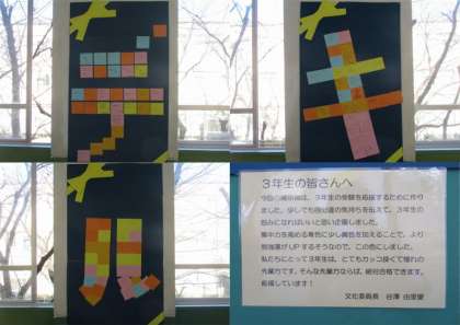 今回の掲示物は,3年生の受験を応援するために作りました。少しでも自分達の気持ちを伝えて,3年生の励みになればいいと思い企画しました。