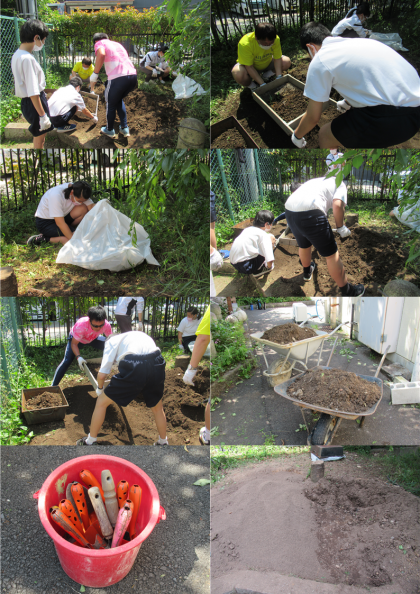 1組は、昨年度開墾した場所を整備し直して、菜園を作っています。