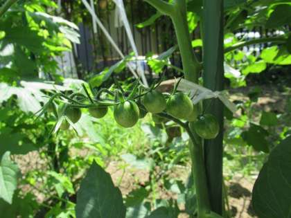 上の写真は以前にお知らせした1組の畑の様子です。こまめに水やりもして手入れしていますから、ゴーヤ、キュウリ、トマト、みんな無事に育っていますよ!