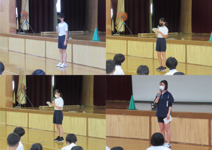 ★僕たちの学年は、2が月遅れて中学校生活がスタートしました。コロナでいろんな行事が削られ、チャレンジ体験もなく・・・。学年としての取組は、もしかしたらこの修学旅行が初めてかもしれません。だから楽しみましょう!でも、その中で大切なことがあります。それはお礼の気持ちや感謝の気持ちです。この気持ちを忘れずに、この3日間を過ごしていきましょう!(Kさん)