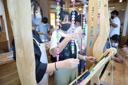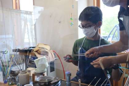 ガラスの色を選んで、加熱しながら模様をつけて丸めます。一人一人のセンスが光りますね!