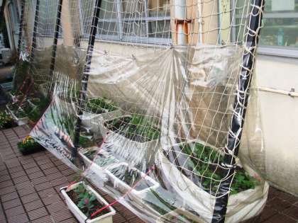「緑のカーテン」の場所が,(ミニ)ビニールハウス(温室)になりました。スナップエンドウの蔓も,グングン伸びるかな?