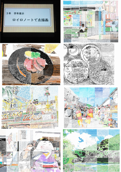 3年生は、各クラスが修学旅行で撮った写真を点描画で表し、それにタイトルをつけたものです。