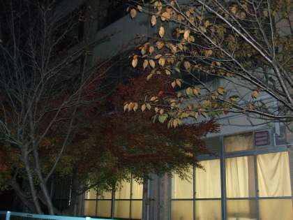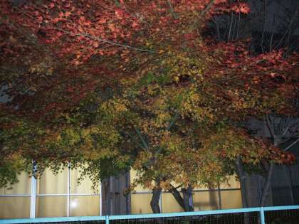部活動完全下校後,施錠のために校舎を回っていると,思わず見とれました。(太秦中の校内を歩いていると,何かに見とれることがよくあるのですが)中庭西端の紅葉が,まだ電気のついている部屋の明かりに照らされて幻想的に浮かび上がっていました。