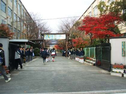 挨拶運動の中,「Change Challenge Campaign」の看板をくぐって,今日も元気に登校です。