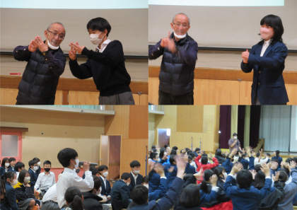 1年生は、今日京都市聴覚障害者協会から講師のNさんと手話通訳者のHさんに来ていただき、講演会を開きました。ねらいは次の2つです。