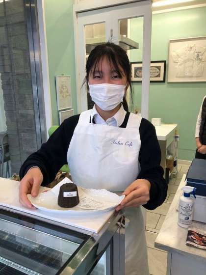 お客様対応や清掃、キッチンに入って商品の箱詰め、お菓子作りにもチャレンジしていました。商品の飾りのリボン結びを練習中だそうです。明るくて頑張り屋で笑顔が素敵だと、お店の方に褒めていただきました。