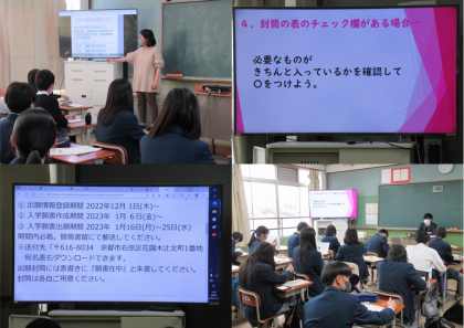 今日は、3年生の先生たちが点検してくださった私学願書を返却してもらいました。返却してもらった願書は、出願期間に合わせて各自で郵送することになります。