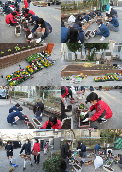 など、卒業式を美しく彩ってくれる花を、門の両サイド、そして入ったところの花壇などにキレイに植えてくれました。バレー部のみんなもボランティアで参加してくれました。
