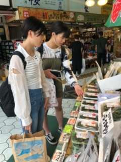 家族へのお土産を、試食して悩みながら選んでいます