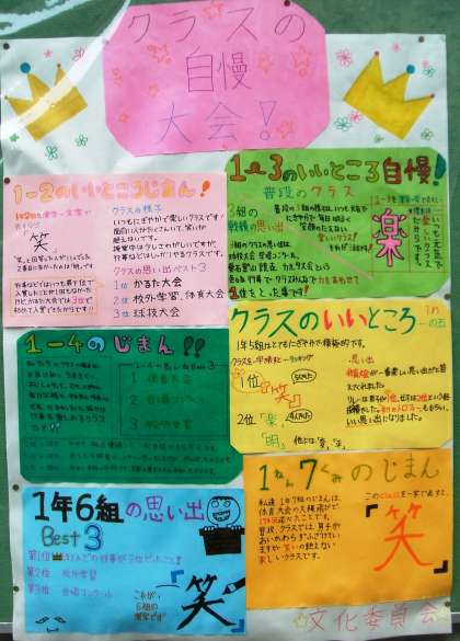 「文化委員会」…「クラスのいいところ自慢大会」…「クラスでのアンケートから,クラスのいいところをポスター掲示で紹介!」
