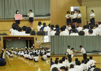 2年生のプログラムは、各クラスの評議委員から1学期の振り返り発表の後、球技大会表彰、月1美化点検表彰、そして、夏休み中の生活面・学習面等についての話。