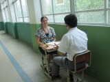 下の左の写真は、R先生に英語で自己紹介して質問をしているところ。右はヘッドセットをつけて「A Mother’s Lullaby」の音読を録画しているところです。この教材は広島の原爆についての物語なので、気持ちを込めて情景が思う浮かぶように音読しています。