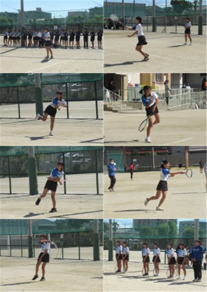 女子ソフトテニス部が、四条中学校で新人戦団体戦に挑みました。シード校なので、対戦校となる相手の試合を見ながらアップ。
