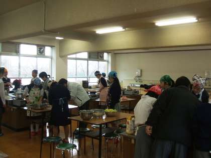 1組が,本年度2回目の近隣校交流を行っています。朝から,四条中学校・双ヶ丘中学校・梅津中学校の皆さんが来てくれて,協力して調理実習をしています。下ごしらえから,自分たちで丁寧にやっています。さて,今日のメニューは?? ヒント:肉・イカ・キャベツ・山芋・紅しょうが・鰹節…。