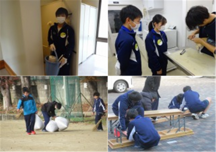 下の写真は、保育園・飲食店・病院・宿泊施設・動物病院、学校で落ち葉清掃と長いすの修理の様子です。